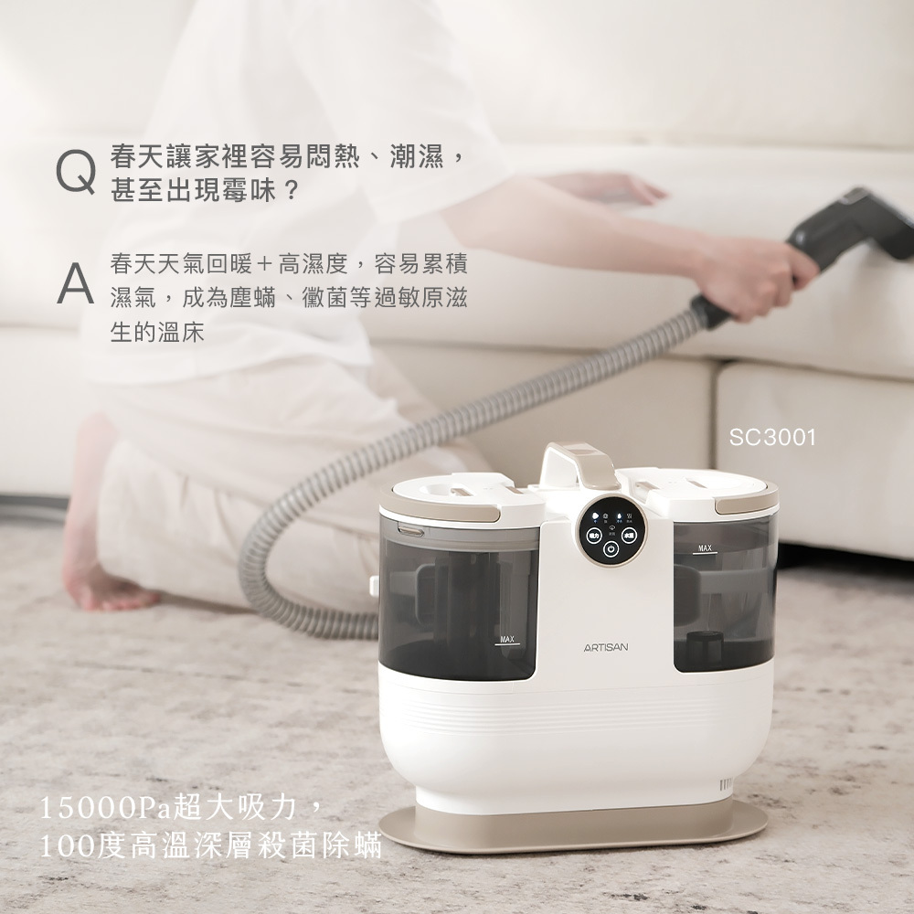沙發、床墊、地毯等織品內部是生活中每天都會接觸的親膚家具,想要消滅過敏原溫床,就要把藏在裡面的髒污細菌真正清除。建議搭配 ARTISAN SC3001 高效蒸氣防霉織物清潔機,透過 100 度高溫蒸氣+15000Pa 超強吸力,深入織品纖維 8.5cm,溶污、殺菌、除蟎一次搞定,不論是經血、尿漬、汗漬,或者濕氣、塵蟎以及黴菌都能輕鬆帶走,從源頭改善過敏問題,讓肌膚與呼吸道得到照顧,打造乾爽潔淨的居家環境。