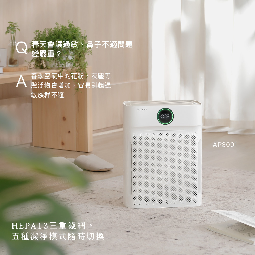 面對過敏不適感,建議選擇一台能長時間穩定運作的空氣清淨設備,ARTISAN AP3001 負離子空氣清淨機搭載前置+ HEPA13 +活性碳三重濾網,快速淨化空氣中的 PM2.5、春季花粉以及病毒,具備五種風量模式+2 / 4 / 8 小時定時設定,輕鬆過濾空氣髒汙,此外,還有為毛孩家庭打造寵物模式,能強效吸毛去味,隨時維持環境清新品質,守護呼吸道健康,而且扁身造型設計,就算是小宅也能輕鬆擺放。