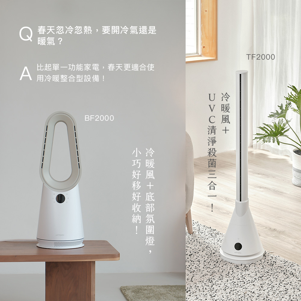 推薦大家可以根據個人需求挑選多功能設備,ARTISAN 四季扇系列 TF2000 與 BF2000 都能幫助你維持穩定室內溫度:TF2000 冷暖風隨時切換,縱長吹拂全身,兼具 UVC 紫外線清淨殺菌,促進空氣循環與淨化環境一次搞定,適合擺放在多人進出的客廳或坪數較大的主臥室;若是空間較小的小宅租屋族或工作室,可以選擇精巧版的 BF2000,一樣能自由切換冷暖風,同時體積輕巧好收納,還有底部氛圍燈可作為貼心小夜燈。選擇循環扇不僅能調節換季溫度,良好的對流循環也能避免濕氣與過敏原堆積在室內,進而遠離過敏,提升生活舒適度。