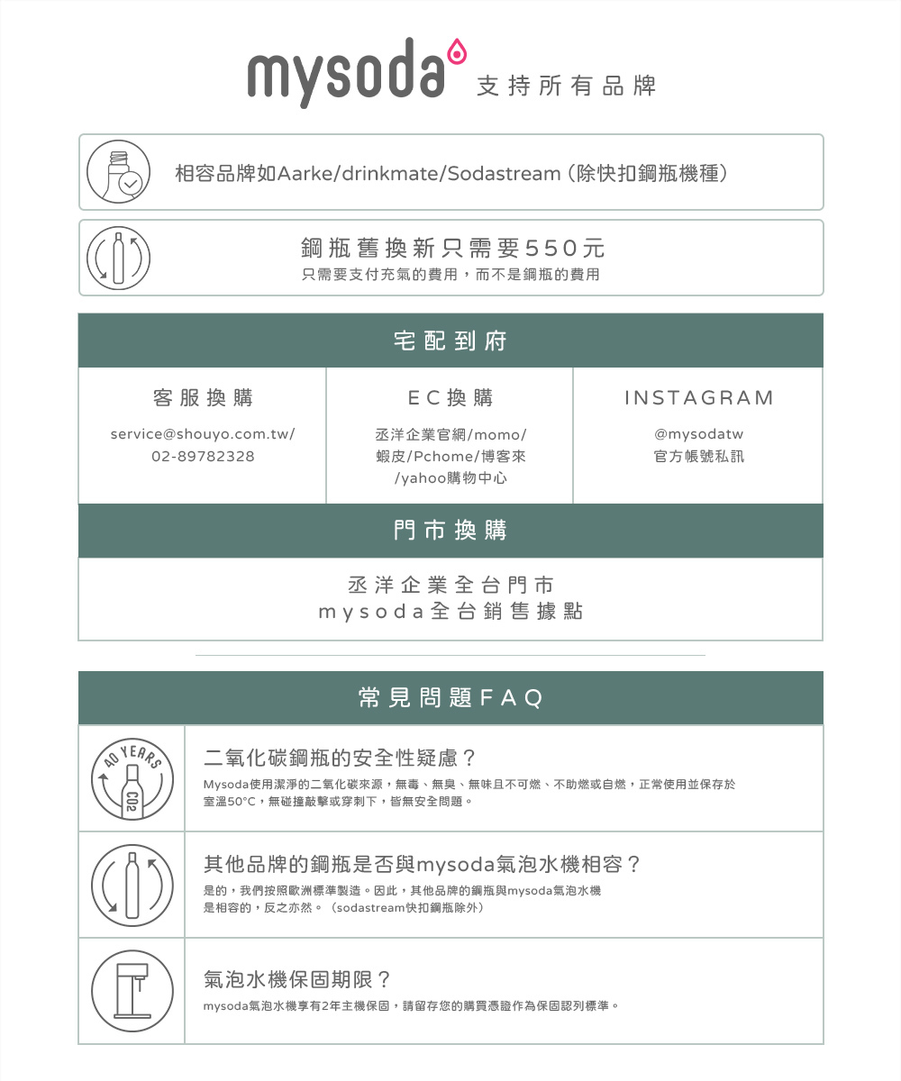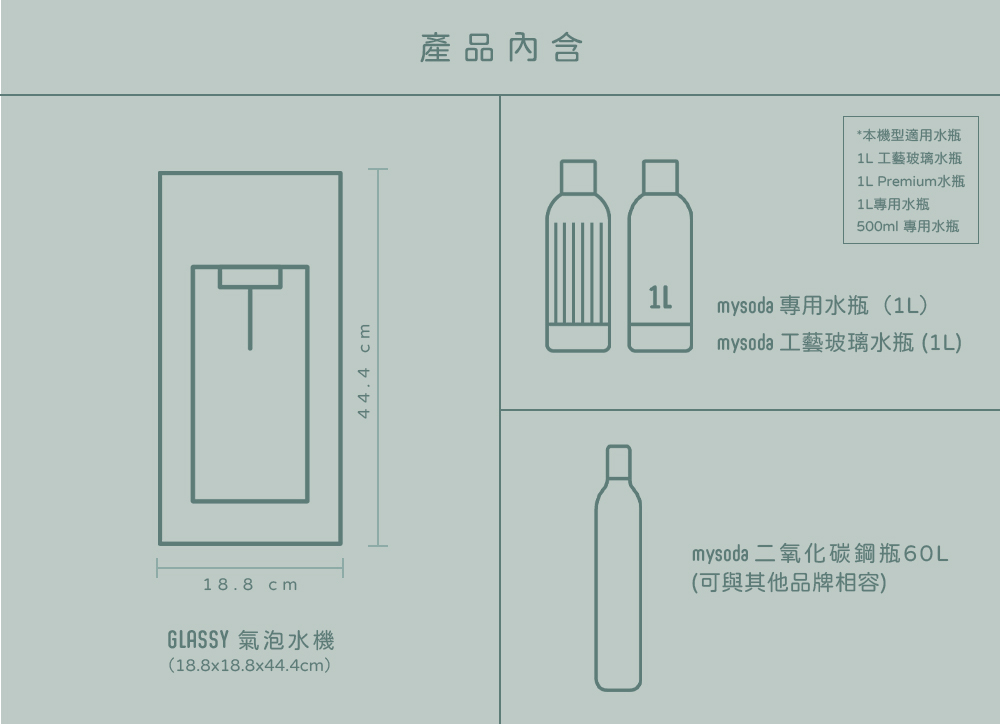 .產品內容:氣泡水機1入、1L工藝玻璃1入、1L Premium水瓶1入、全新425g二氧化碳鋼瓶1入